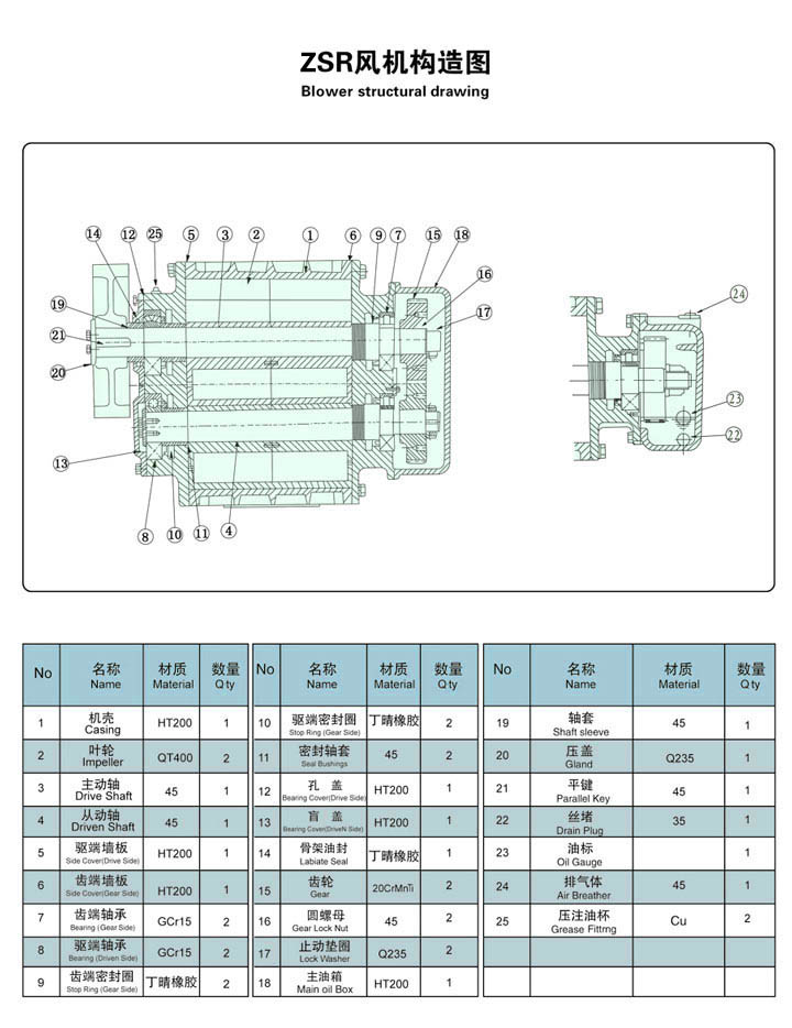 5、羅茨鼓風機葉輪與機殼、葉輪與側板、葉輪與葉輪間隙在出廠時已調好,重新裝配時要保證該間隙。